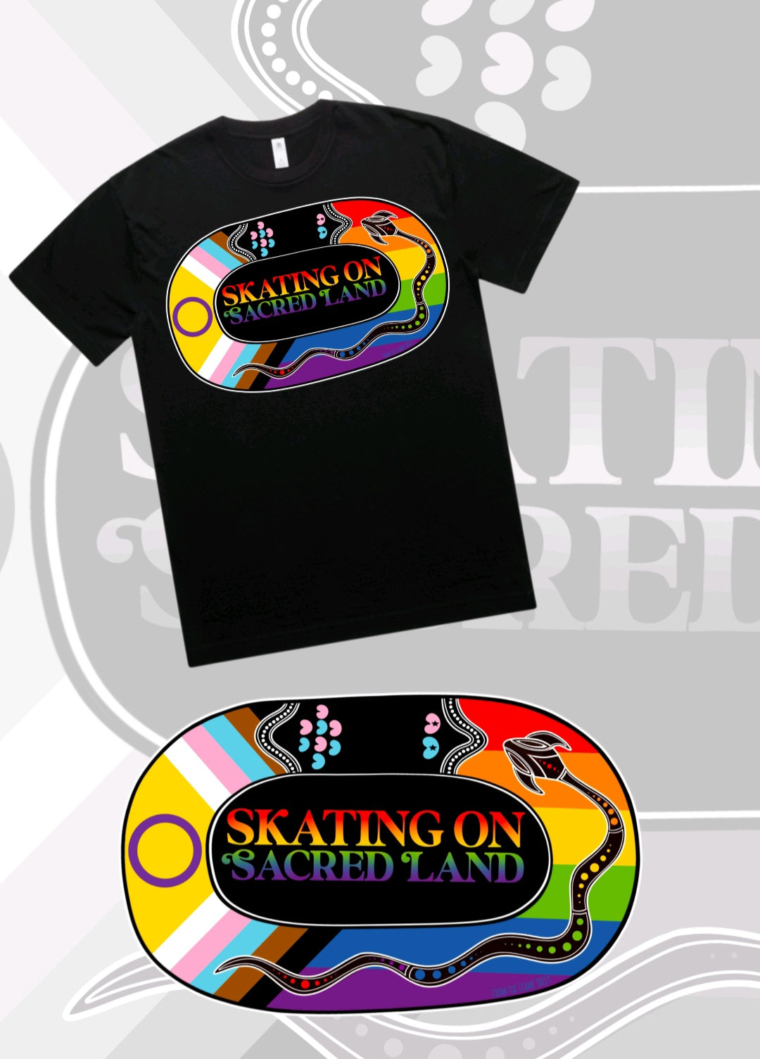Skating on Sacred Land with Pride is a celebration of queerness, blakness and the dynamic sport of Roller Derby. It features the vibrant Pride flag woven together with the Rainbow Serpent, our powerful Creator Spirit, to acknowledge that we were all made as equals.