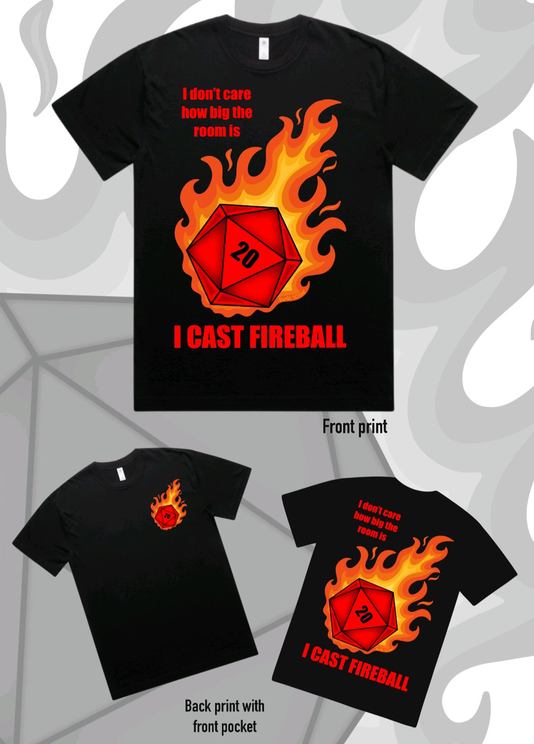 Made in collaboration with my son, this fun and fiery tee celebrates the players who love going big, even when the battlefield definitely isn’t. Featuring a flaming d20 and the classic chaotic-caster mantra “I don’t care how big the room is, I cast fireball,” this shirt is perfect for D&D fans of all ages.